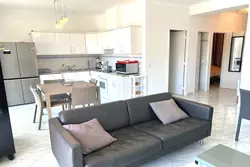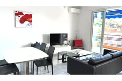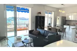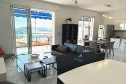 Vue mer et village, central, commerces et plages à pied, lumineux 3 pièces ouvrant sur grande terrasse de 18 m2 , composé d'un hall, séjour double - salle à manger avec cuisine ouverte équipée avec lave-vaisselle et réfrigérateur américain four et micro-ondes, ouvrant sur la terrasse par deux grandes baies vitrées, climatisation réversible, rangements, deux chambres une avec placard, une salle de douches avec vasque, sèche-serviettes et lave-linge, un toilette séparé. Volets roulants électriques, stores toile, assez bon état général, disponible rapidement. Parking communal à proximité.