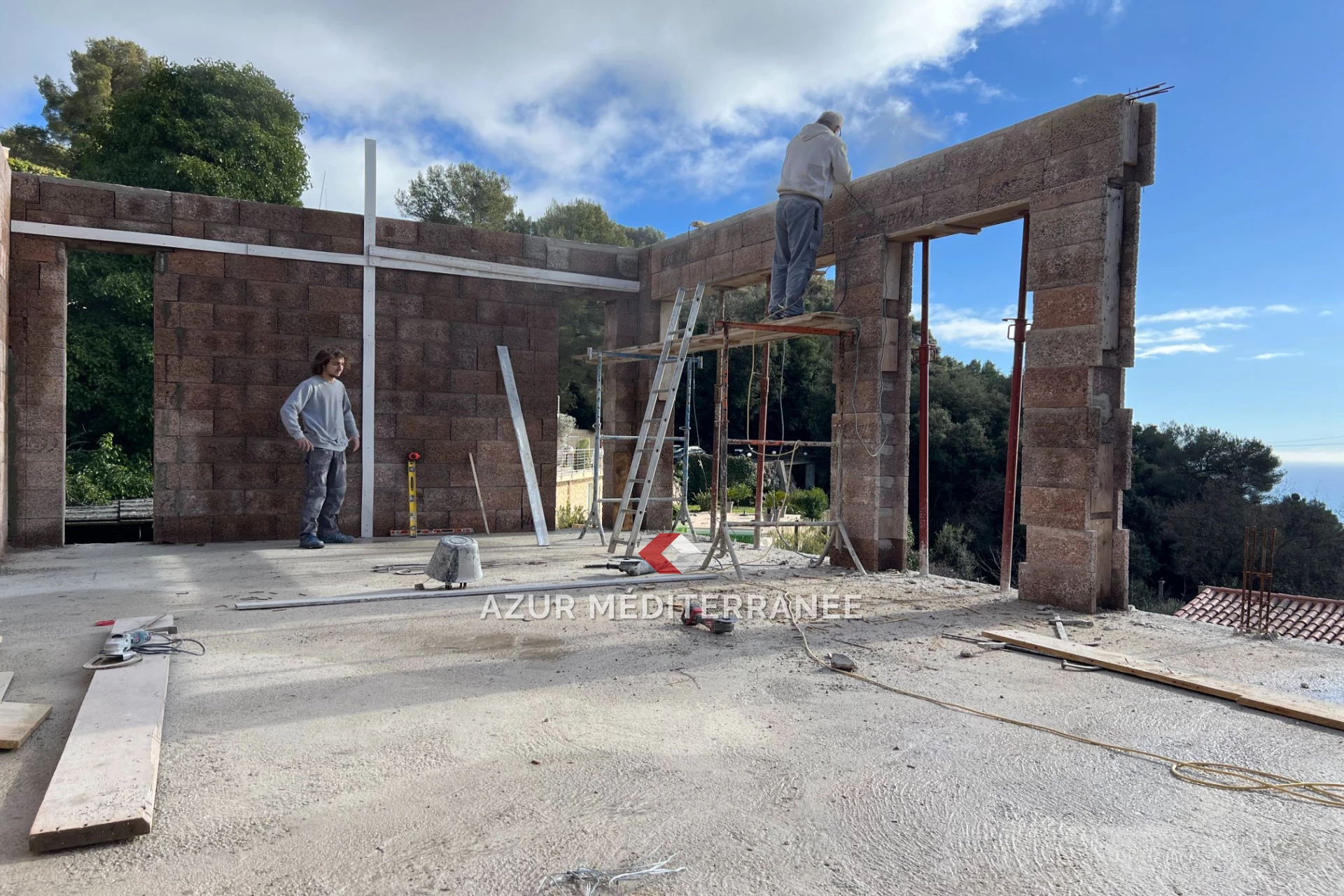 EXCLUSIF : Vue mer et colline, quartier résidentiel proche de Monaco, villa contemporaine en cours de construction - structure et toit-terrasse actuellement en cours de réalisation, sur une parcelle plate ensoleillée très calme de 776 m2 , permis de construire avec piscine purgé pour une villa contemporaine de 185 m2 sur deux niveaux, avec belle piscine non réalisée côté Sud. Un vaste séjour et cuisine et une chambre de maître en suite ont été prévus à l'étage, trois chambres en suite en rez- de chaussée, mais il est possible d'intervertir les niveaux. Parking aménageable sur la parcelle 1394 m2 en contrebas, accès par escalier. La villa sera vendue en état de structure seule et le toit-terrasse réalisés, terrain nivelé devant la villa en état de structure vide, tous les aménagements huisseries, fenêtres vitrages équipements sanitaires cuisine carrelages seront à terminer, ascenseur ou escalier à installer pour rejoindre la villa depuis la planche - parking.
